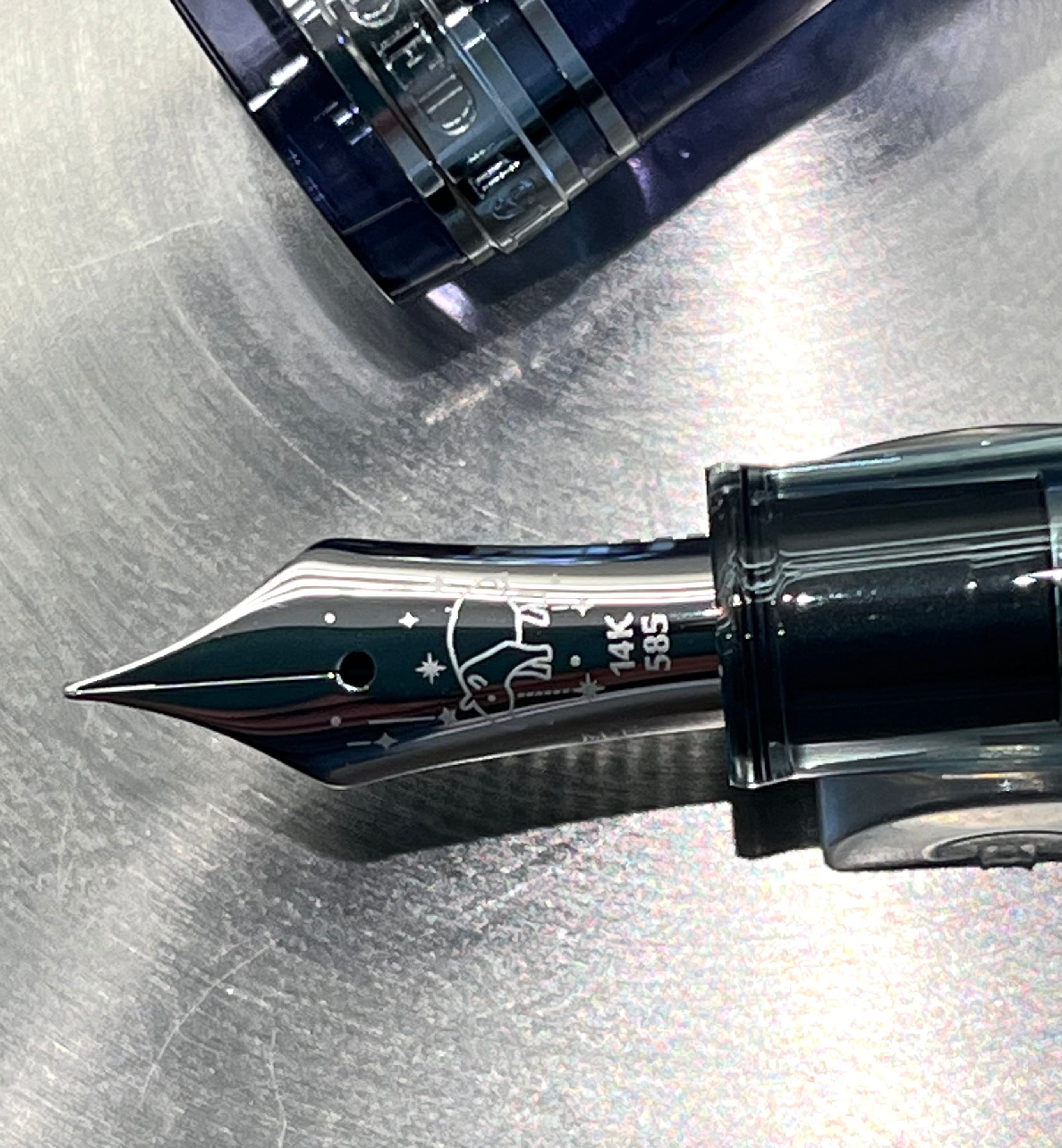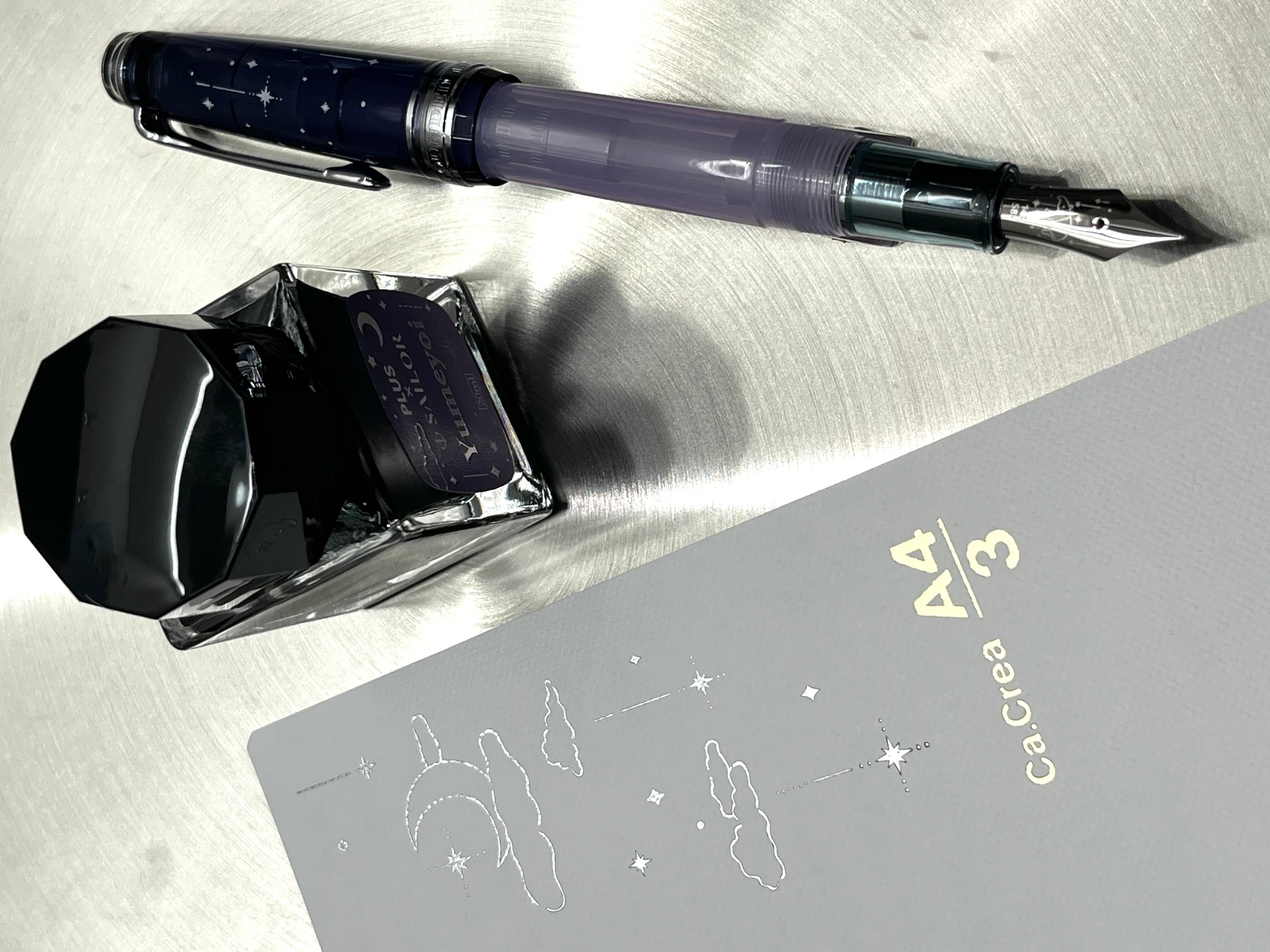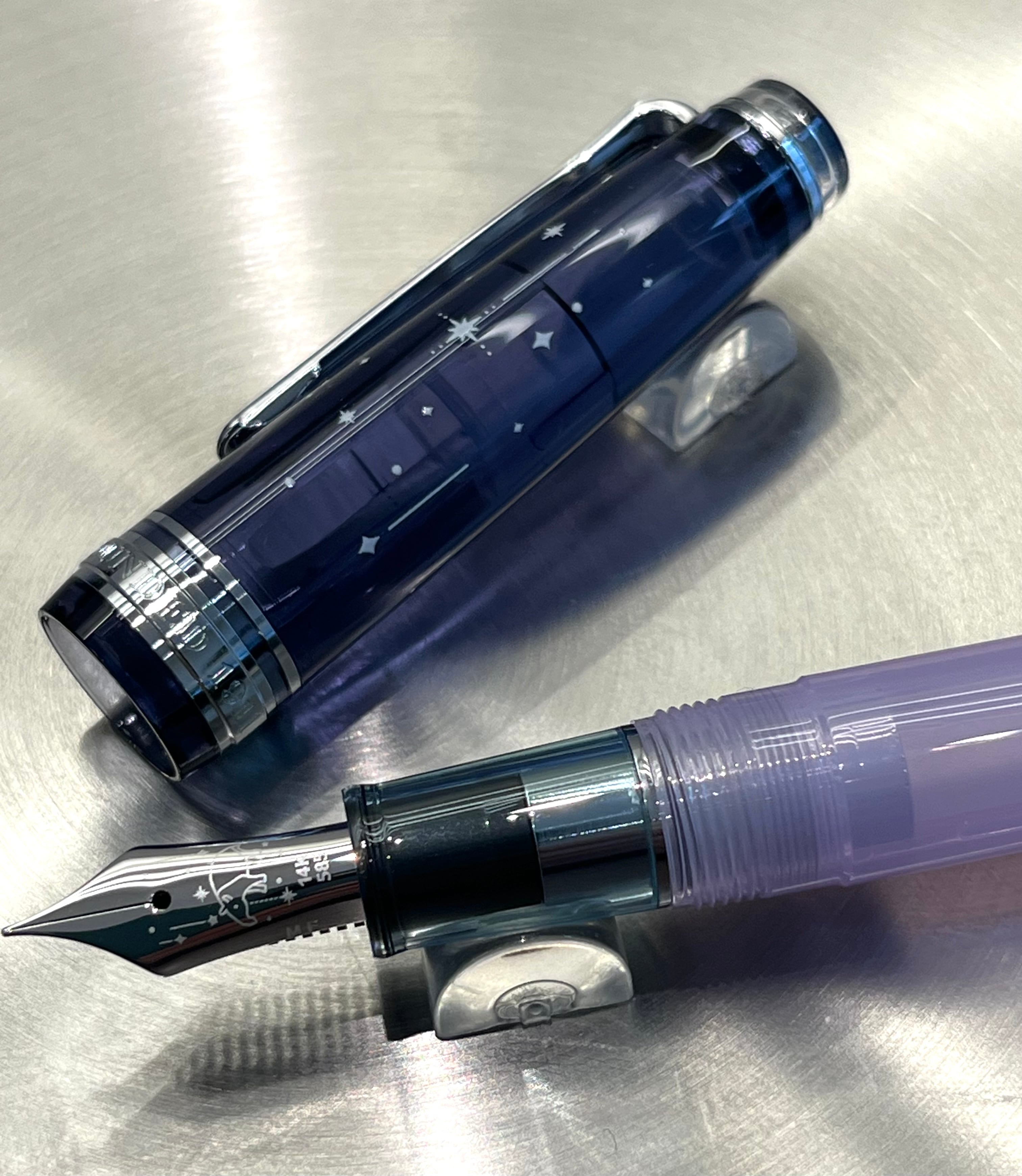 万年筆は、静かな夜のはじまりを感じさせるクリアネイビーの蓋と神秘的な淡いトーンのパープルのボディとを組み合わせました。蓋栓飾りは月と星、ペン先は夢にちなんだバクをあしらっています。